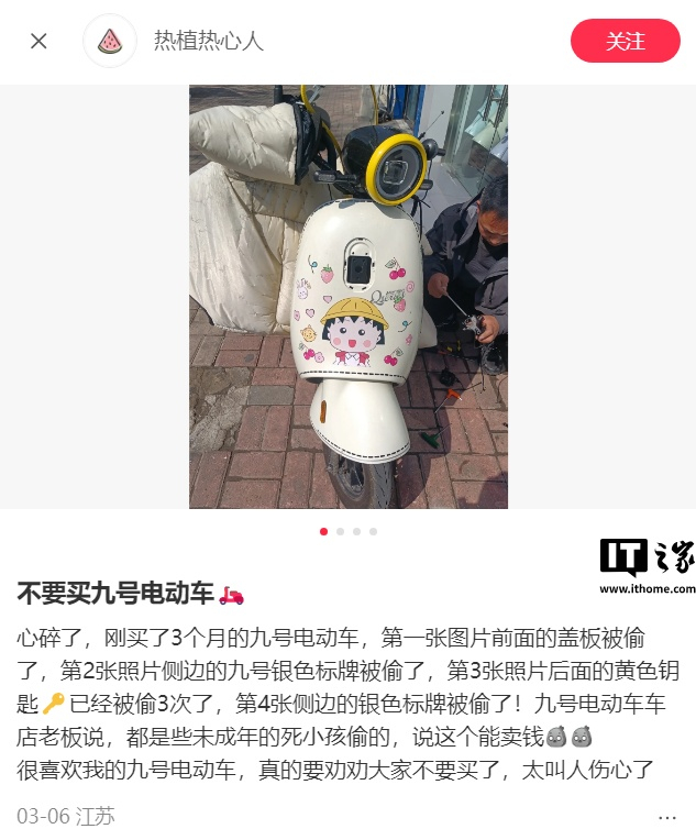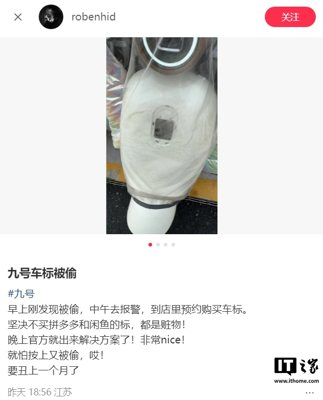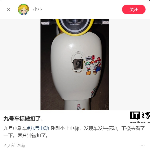 IT之家 3 月 29 日消息,九号电动昨日发文称,关注到部分用户反馈九号电动车车标被他人擅自拆卸的情况。