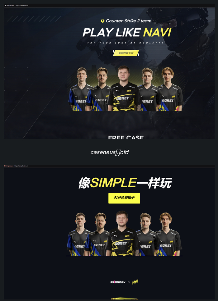 该安全公司透露,相应黑客主要针对英语用户和简体中文用户进行攻击,相应钓鱼网站主要展示一批 CS 箱子图标,并有所谓“免费开箱”字眼,玩家点击“箱子”图标就会重定向到所谓“登录 Steam 账号”窗口,而该窗口实为黑客利用 BitB 技术伪造的假窗口,一旦玩家输入账号密码,黑客就能直接接管他们的 Steam 账号。为了吸引更多玩家上钩,黑客还冒充 Navi 电竞选手,通过各种视频平台分发钓鱼网站的信息。