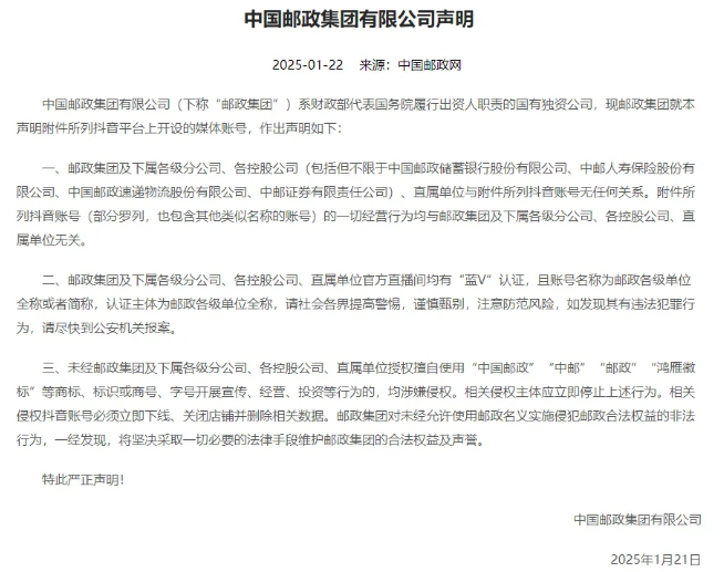 中国邮政集团称,公司将持续发动全系统力量,常态化开展维权打假工作,最大限度减少名称侵权行为对中国邮政品牌信誉的损害和企业经济利益的侵蚀,维护中国邮政合法权益。