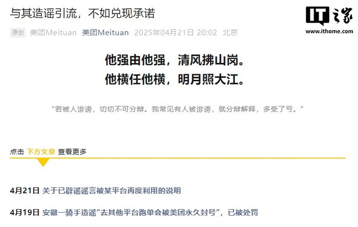 IT之家 4 月 21 日消息,美团官方公众号今晚发声:“与其造谣引流,不如兑现承诺”,并配文:“他强由他强,清风拂山岗。他横任他横,明月照大江。”