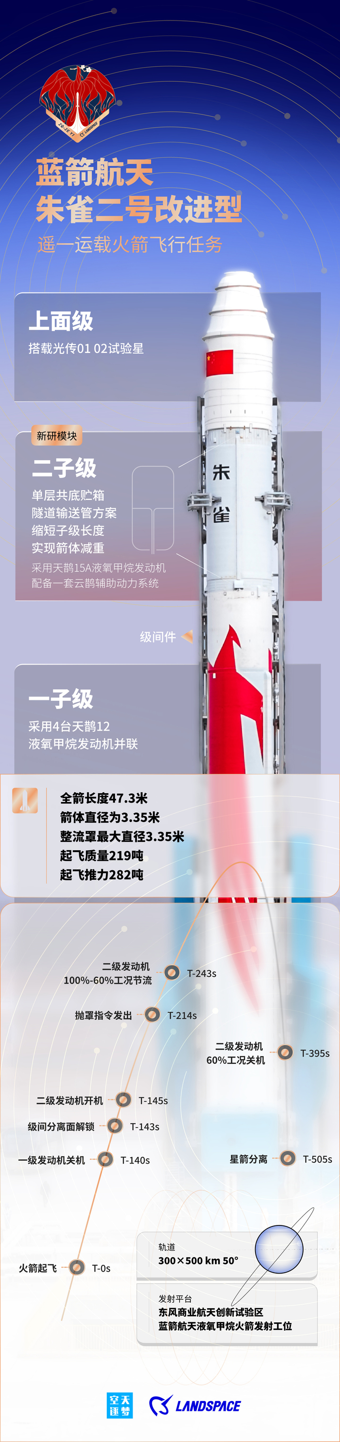 IT之家查询官方资料获悉,朱雀二号改进型(ZQ-2E)运载火箭为两级构型,箭体直径 3.35 米,全箭高度 47.3 米(基本型 49.5 米),起飞重量 220 吨(基本型 219 吨),起飞推力 282 吨(基本型 268 吨),一级采用 4 台天鹊 80 吨级液氧甲烷发动机 TQ-12 并联,二级采用 1 台天鹊 80 吨级液氧甲烷发动机 TQ-15A。
