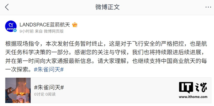 IT之家 5 月 15 日消息,国内商业航天公司蓝箭航天今日发布公告: