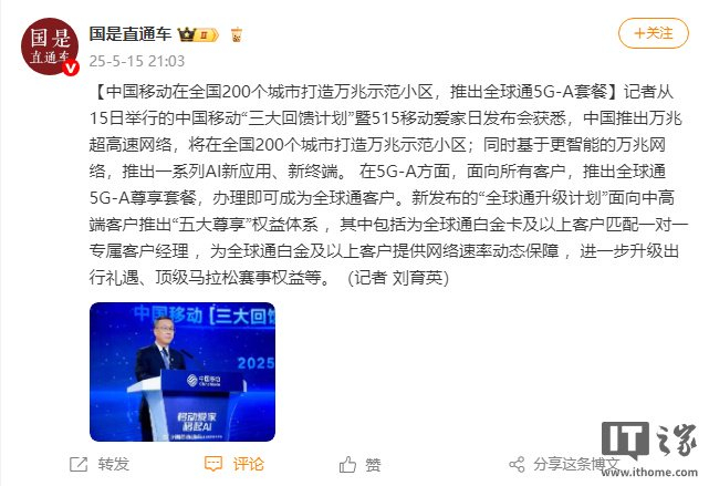 IT之家 5 月 15 日消息,据国是直通车报道,在今日举行的中国移动“三大回馈计划”暨 515 移动爱家日发布会上,中国移动宣布将在全国 200 个城市打造万兆示范小区;同时基于更智能的万兆网络,推出一系列 AI 新应用、新终端。