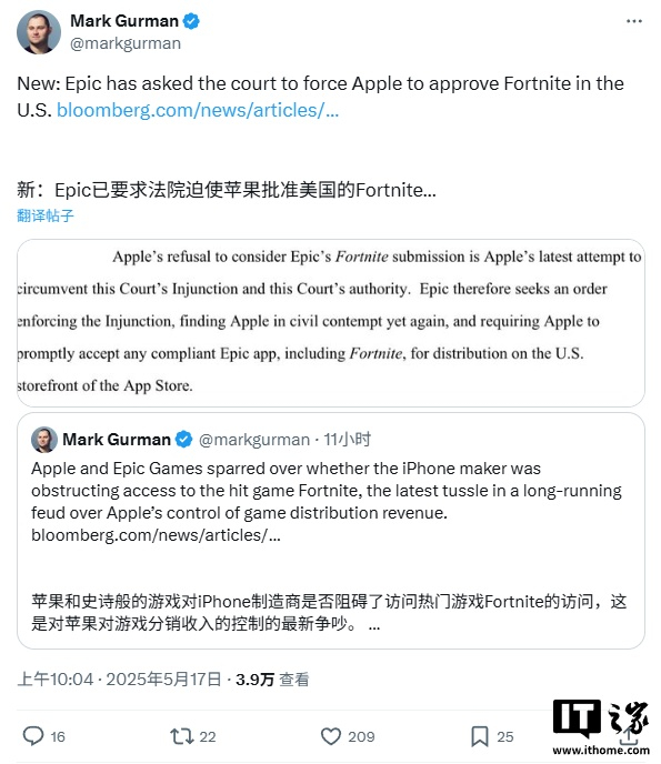 IT之家 5 月 17 日消息,当地时间周五晚间,Epic Games 致信法官 Yvonne Gonzalez Rogers,指控苹果公司拒绝审核《堡垒之夜》的重新上架申请,称其为“无视法庭禁令与司法权威的最新尝试”。