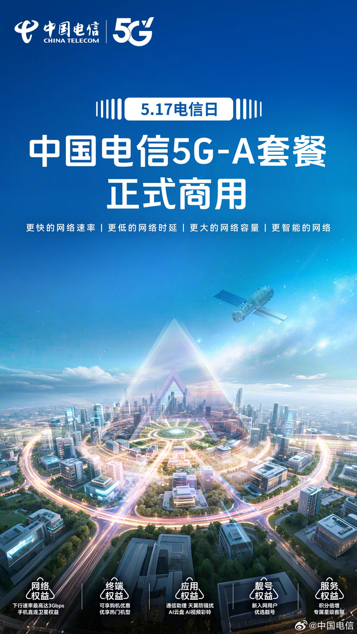 另外,中国电信 5G-A 套餐已于昨日(5 月 17 日)正式商用,5G-A 和 5G 相比,能够在容量、速率、时延、定位、可靠性等方面实现大幅提升,可以带来更快、更优质的通信体验,并有望实现低成本千亿物联。