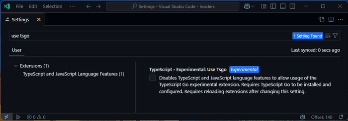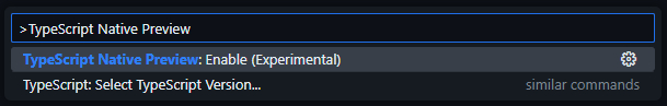或者,你可以在设置 UI 中通过配置“TypeScript > Experimental: Use Tsgo”来切换此功能。