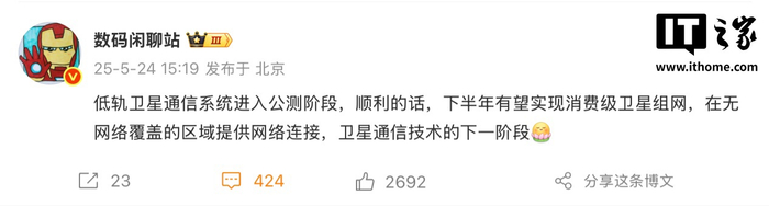 IT之家 5 月 24 日消息,博主 @数码闲聊站 发文,透露我国低轨卫星通信系统进入公测阶段,“顺利的话,下半年有望实现消费级卫星组网,在无网络覆盖的区域提供网络连接”。