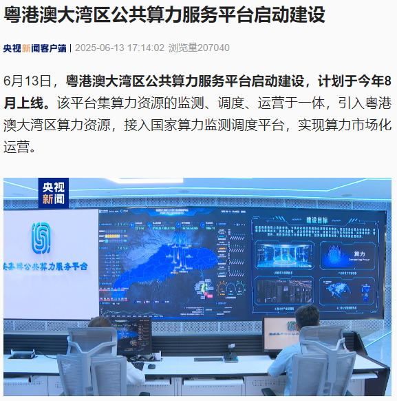 IT之家 6 月 13 日消息,据央视新闻报道,粤港澳大湾区公共算力服务平台今日启动建设,计划于今年 8 月上线。该平台集算力资源的监测、调度、运营于一体,引入粤港澳大湾区算力资源,接入国家算力监测调度平台,实现算力市场化运营。