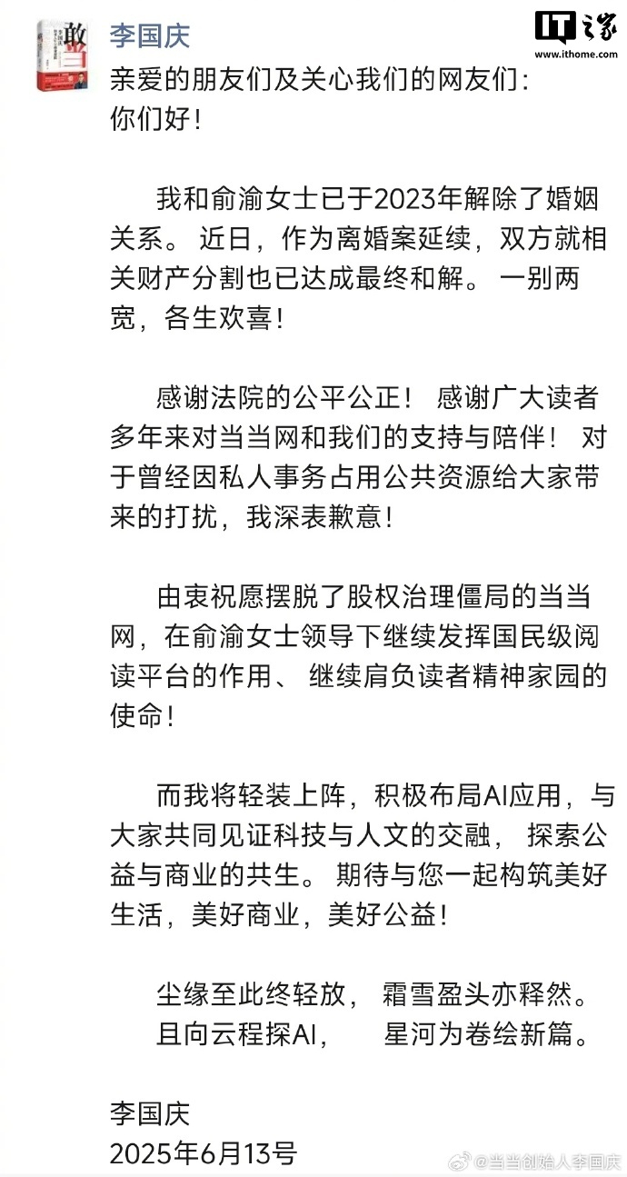 IT之家 6 月 13 日消息,当当网创始人李国庆今日宣布和俞渝女士已于 2023 年解除了婚姻关系。近日,作为离婚案延续,双方就相关财产分割也已达成最终和解。此外,他还宣布将积极布局 AI 应用。
