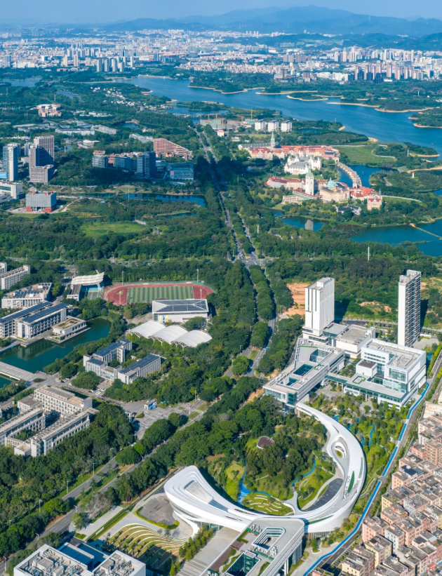 ▲ 松山湖校区,图源“大湾区大学”公众号2019 年,《粤港澳大湾区发展规划纲要》正式发布,明确提出“打造教育和人才高地”,成为学校孕育的时代背景。2020 年,广东省和东莞市政府积极响应国家号召,启动大湾区大学的筹备工作,高标准高规格规划双校区用地 2000 亩、建筑 100 万平方米。松山湖校区位于美丽的松山湖畔;滨海湾校区位于虎门大桥附近,背山面海。2021 年,大湾区大学松山湖校区奠基,校园建设全面启动。