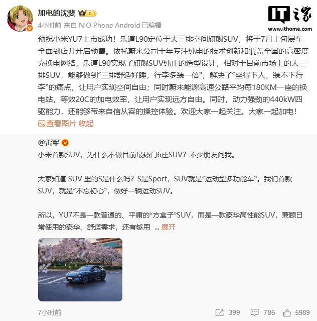 IT之家 6 月 23 日消息,蔚来高级副总裁兼乐道汽车总裁沈斐今日发文预祝小米 YU7 上市成功,并透露乐道 L90 将于 7 月上旬展车全面到店并开启预售。