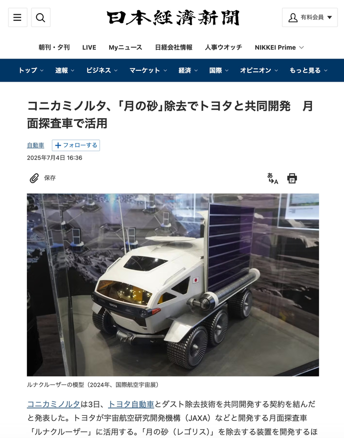 柯尼卡美能达将在多功能打印设备中积累的碳粉清除技术加以转用,通过静电方式清除附着在车体表面的风化层。丰田方面正以 2031 年以后为目标推进 Lunar Cruiser 的发射计划,这款月面车需具备在极端环境下行驶逾 1 万公里的能力。