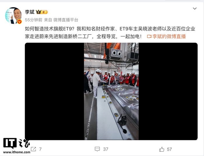 IT之家 7 月 6 日消息,知名财经作家、ET9 车主吴晓波及近百位企业家今天参访合肥蔚来先进制造新桥二工厂,蔚来创始人、董事长兼 CEO 李斌在直播中表示,蔚来是进驻新桥园区的第一家企业,新桥园区的蔚来第三工厂将于 9 月正式投产。