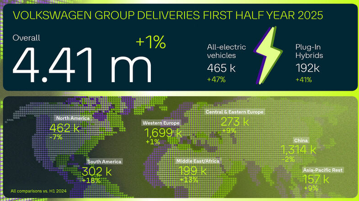 大众汽车集团 2025 上半年全球交付的纯电动汽车数量同比增长 47%,达到 465,500 辆。其中,欧洲(增长 89%)和美国(增长 24%)增长强劲,中国(下降 34%)发展放缓,大众汽车集团在欧洲成为电动汽车市场领导者之一(市场份额约 28%)。