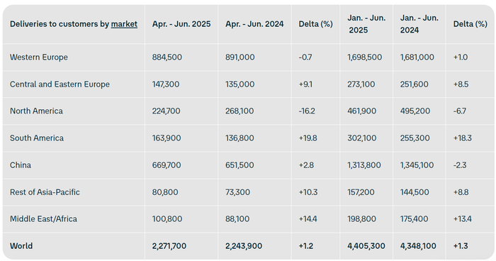 从地区来看,南美洲(增长 18%)、西欧(增长 1%)和中东欧(增长 9%)市场获得交付量增长,中国(下降 2%)和北美(下降 7%)市场交付量下降。