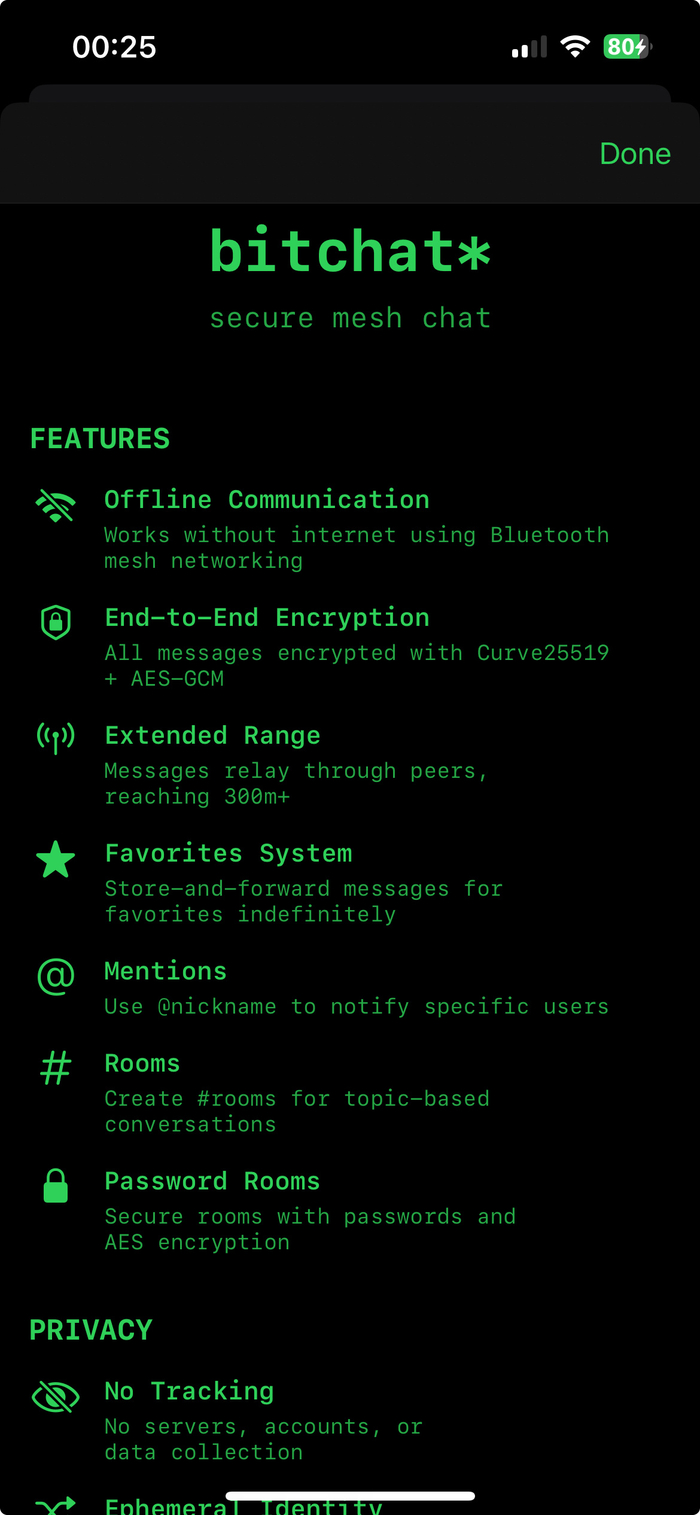 bitchat 是一个利用 BLE 蓝牙低功耗 MESH 通信网络的近场聊天应用,其采用去中心化的无服务器设计,不需要连接到互联网基础设施,甚至不存在账户概念。在通信方面其采用端到端加密的对等传输。