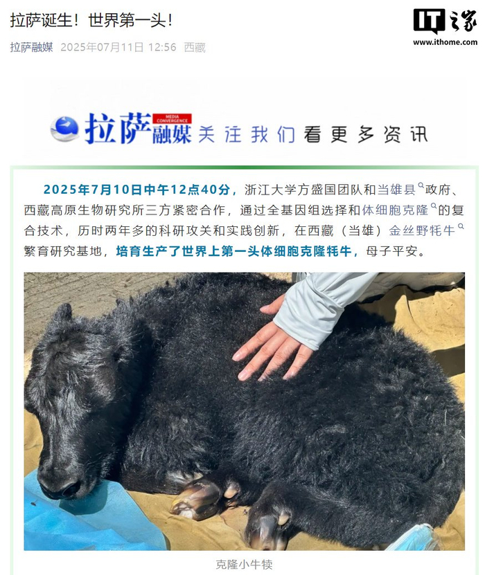IT之家 7 月 11 日消息,历时 2 年多的科研攻关和实践创新,2025 年 7 月 10 日中午 12 点 40 分,浙江大学方盛国团队和当雄县政府、西藏高原生物研究所三方紧密合作,通过全基因组选择和体细胞克隆的复合技术,在西藏(当雄)金丝野牦牛繁育研究基地,培育生产了世界上第一头体细胞克隆牦牛,母子平安。