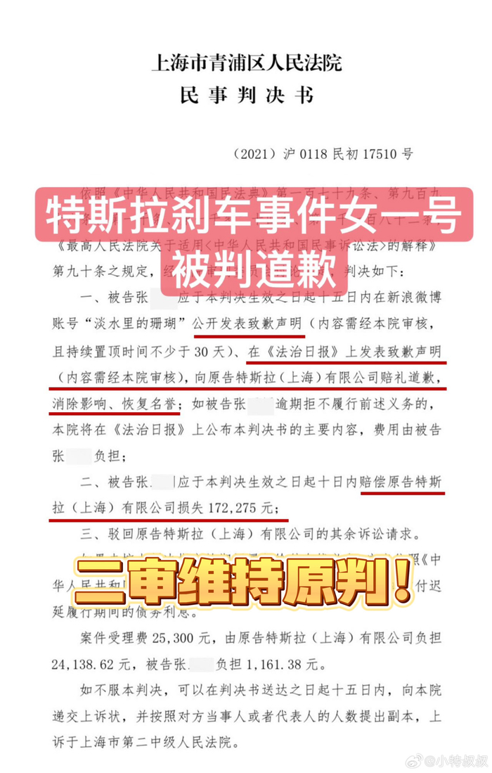 据博主 @小特叔叔 晒出的判决书图片,7 月 11 日,法院作出二审判决,均维持原判:上海车展站上特斯拉车顶的河南张女士被认定侵犯特斯拉名誉权,应向特斯拉赔礼道歉并赔偿 17 万元。同时,组织策划特斯拉上海车展事件的媒体人封某,向特斯拉道歉并赔偿 25 万元。