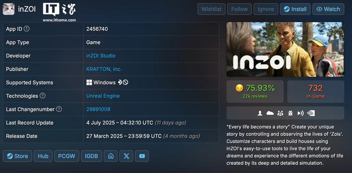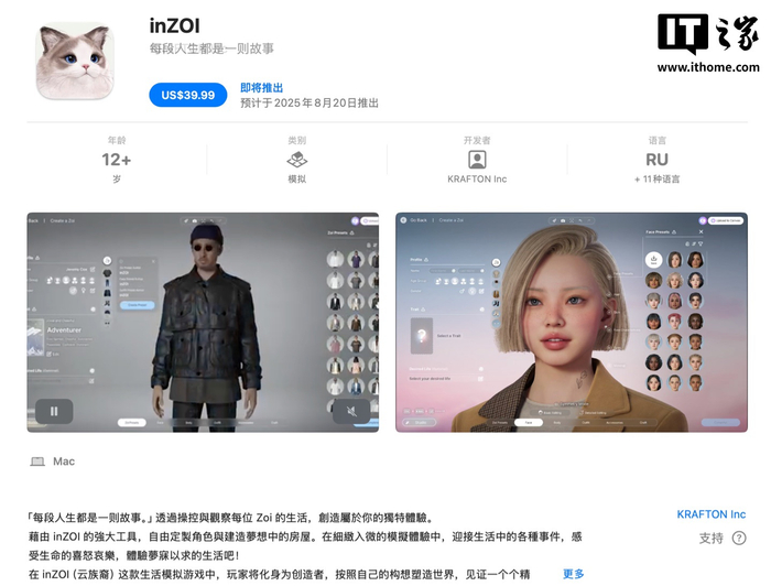 IT之家 7 月 15 日消息,苹果在 WWDC2025 中宣布韩国 KRAFTON(魁匠团)开发的生活模拟新作《云族裔(inZOI)》将登陆苹果 macOS 平台,目前本作已上架 Mac App Store,定价 39.99 美元(IT之家注:现汇率约合 287 元人民币),将于 8 月 20 日发售,游戏只支持 macOS,不支持 iPadOS / iPhone 游玩,IT之家附游戏商品页(https://apps.apple.com/us/app/inzoi/id6742821288?l=zh-Hans-CN&mt=12)。