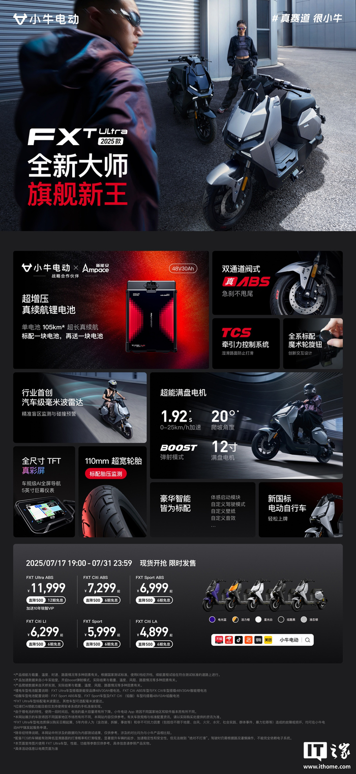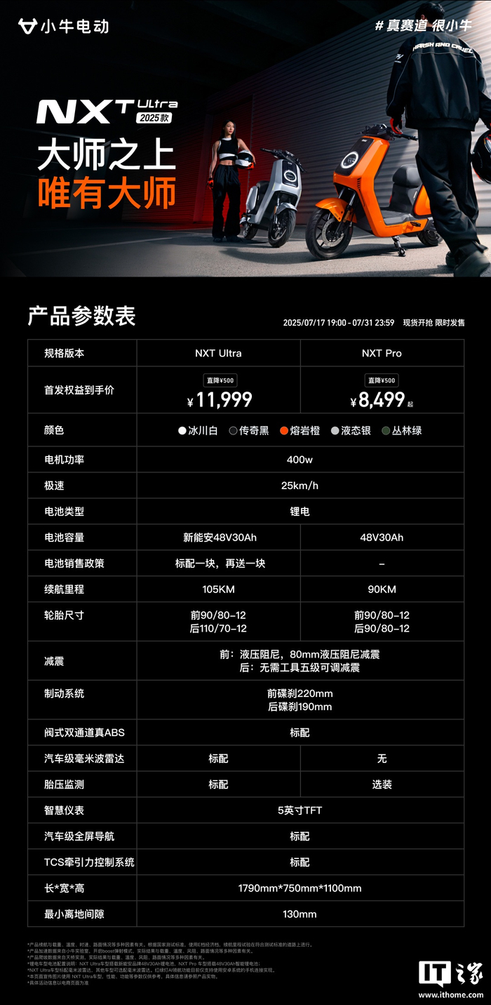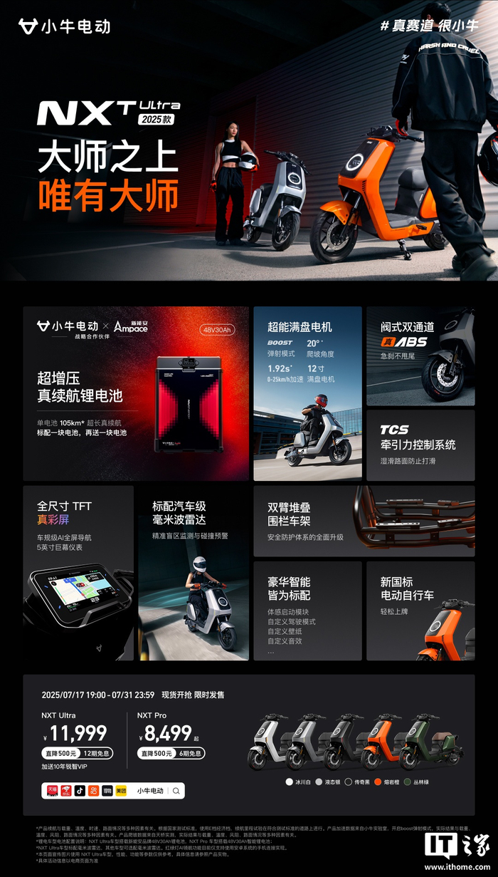 IT之家 7 月 17 日消息,小牛电动今晚发布了两款旗舰新品 —— NXT Ultra 2025 和 FXT Ultra 2025,首发价均为 11999 元。