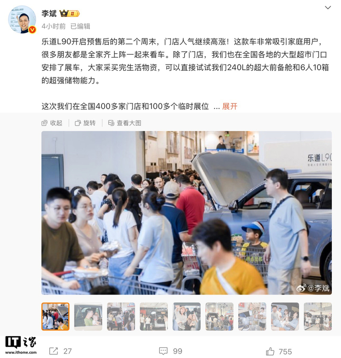 IT之家 7 月 20 日消息,蔚来创始人、董事长、CEO 李斌发文表示,乐道 L90 开启预售后的第二个周末门店人气继续高涨,除了门店,目前官方也在全国多地的大型商场门口安排展车,下周 L90 试驾车将抵达全国门店。