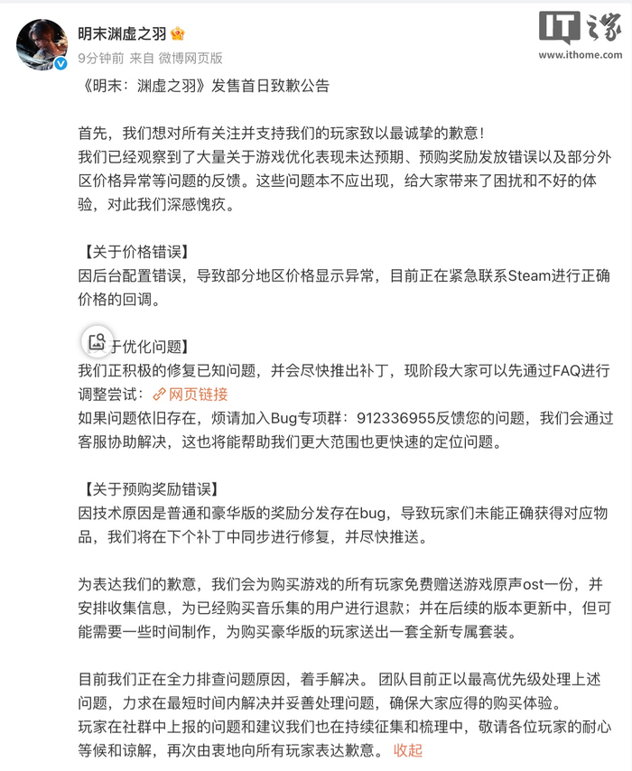 IT之家 7 月 24 日消息,《明末:渊虚之羽》官方微博今晚发布致歉声明,就玩家反馈的游戏优化表现未达预期、预购奖励发放错误、部分外区价格异常等问题进行回应。