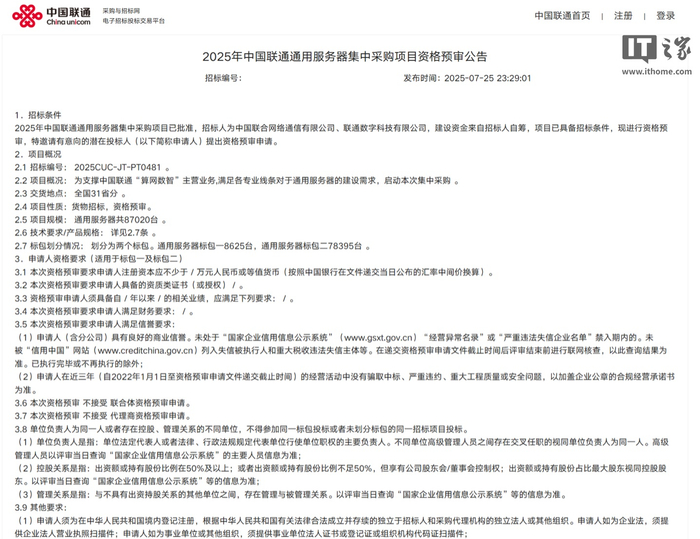 IT之家 7 月 28 日消息,中国联通采购与招标网昨日更新了《2025 年中国联通通用服务器集中采购项目资格预审公告》,招标人为中国联合网络通信有限公司、联通数字科技有限公司。