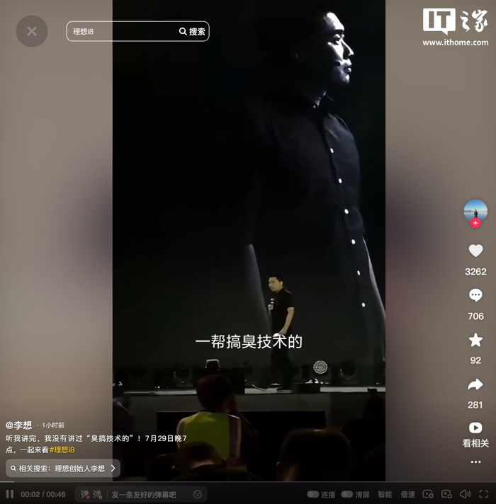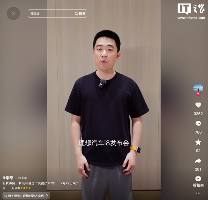 IT之家 7 月 28 日消息,理想汽车 CEO 李想今日在社交平台发布视频,他表示,从没有说过“臭搞技术的”这五个字,求大家帮他辟谣。