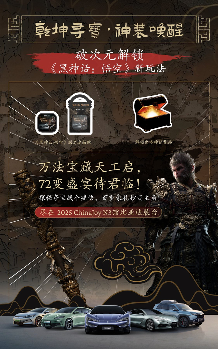 IT之家 7 月 30 日消息,比亚迪汽车刚刚公布了 2025 ChinaJoy 活动安排,包括《黑神话:悟空》联动车型的预告,其中还包括之前从未展示过的方程豹钛 3 神秘限定痛车。