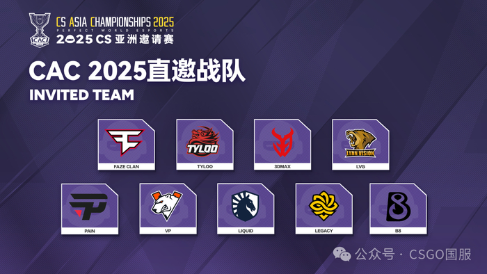 CAC 2025 正赛共 16 支战队参加,直邀战队今日正式官宣,包含 FaZe Clan、TYLOO、3DMAX、Lynn Vision、paiN Gaming、Virtus.pro、Liquid、Legacy、B8 共 9 支战队。