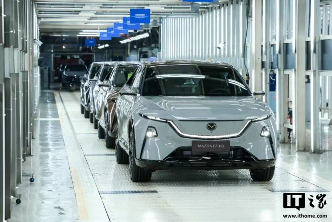 IT之家 8 月 4 日消息,长安马自达今日宣布 EZ-60 在南京工厂正式下线,新车即将进入上市倒计时,该车是长安马自达新能源整车出口中心的第二款全球化车型。截至 8 月 4 日,小订订单已突破 38000 个。