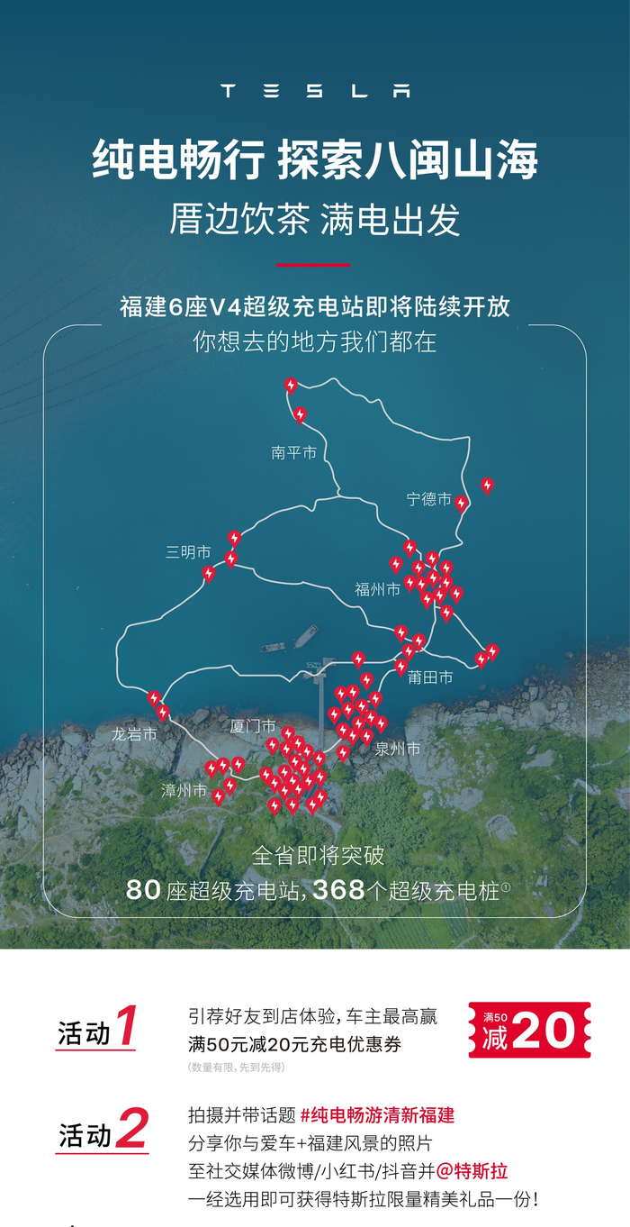 - 活动二:拍摄并带话题#纯电畅游清新福建,分享爱车 + 福建风景照片至微博 / 小红书 / 抖音并 @特斯拉,一经选用即可获得特斯拉限量精美礼品一份。