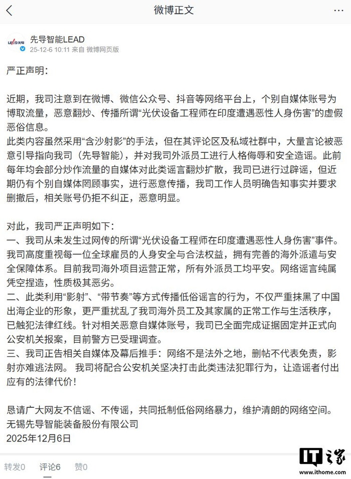 IT之家 12 月 6 日消息,今天上午,无锡先导智能装备股份有限公司发布声明,表示公司从未发生过网传的所谓“光伏设备工程师在印度遭遇恶性人身伤害”事件。