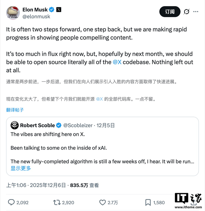 IT之家 12 月 6 日消息,北京时间今天凌晨,马斯克在 X 平台发文透露,X 在向人们展示“引人入胜的内容”这一方面进展迅速,希望下个月就能开源 X 的全部代码,毫无保留。