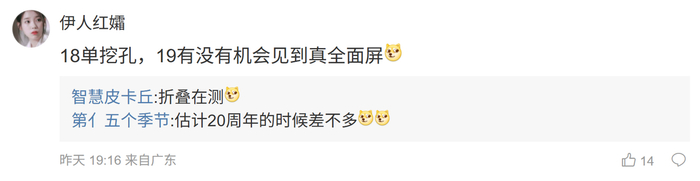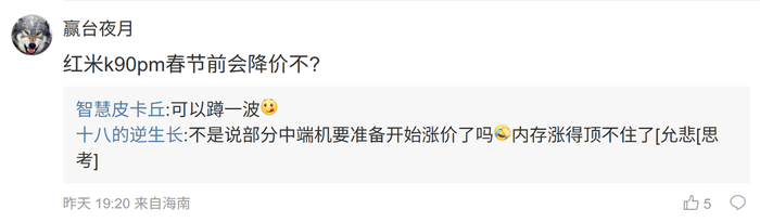 后续有用户在评论区询问:“18 单挖孔,19 有没有机会见到真全面屏”,博主回复道:“折叠在测”;另一名用户则回复道:“红米 k90pm 春节前会降价不?”,博主回复道:“可以蹲一波”;另外一名网友则表示:“标准版没有吧”,博主回应道:“大杯”。