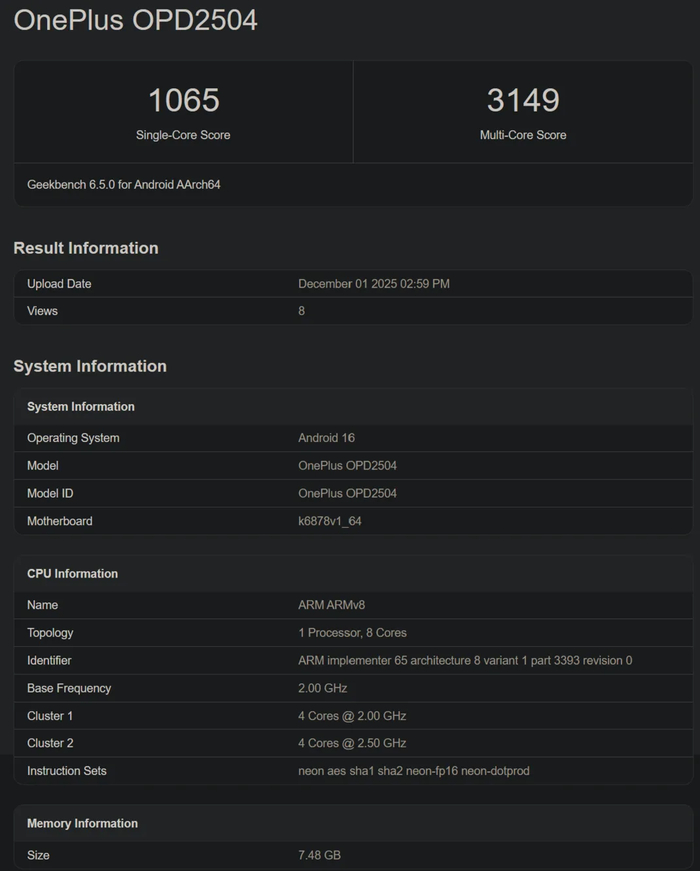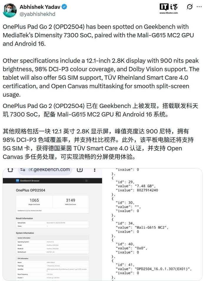 结合IT之家此前援引 NoteBook Check 报道,一加 Pad Go 2 平板已现身 Geekbench 跑分数据库,搭载一枚八核处理器,配备四颗 2.5GHz 大核、四颗 2.0GHz 小核,以及一颗 ARM Mali-G615 MC2 GPU 和 8GB 内存,单核 / 多核分数分别是 1065 分 / 3149 分。