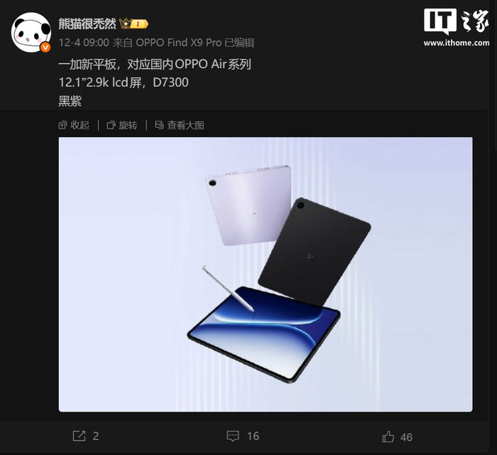 IT之家 12 月 7 日消息,博主 @熊猫很禿然 本周(12 月 4 日)在微博发文称,一加即将推出的某款新平板对应国内的 OPPO Pad Air 系列,配备联发科天玑 7300 芯片,拥有黑色、紫色两种配色可选。