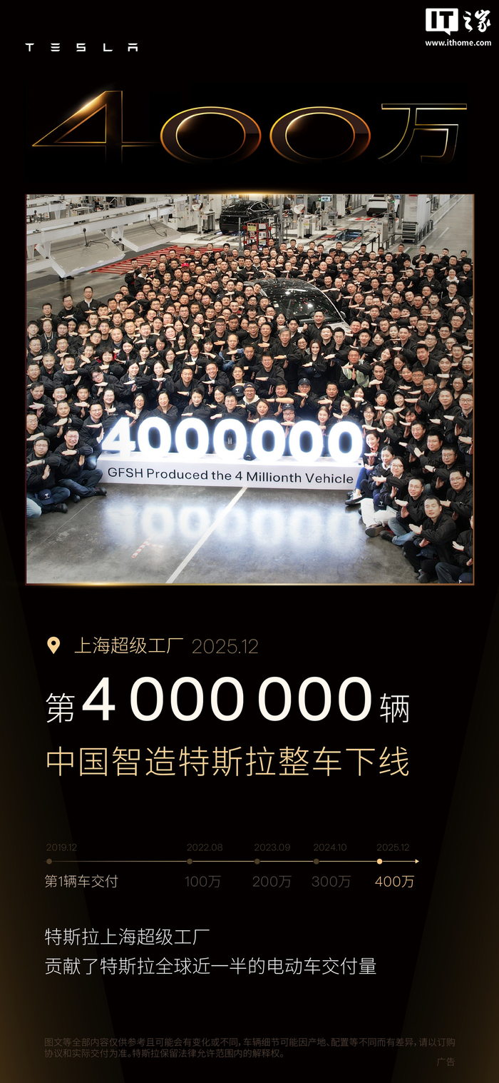 IT之家 12 月 8 日消息,据特斯拉官微消息,第 400 万辆中国智造特斯拉正式下线,为星光金 Model Y L。
