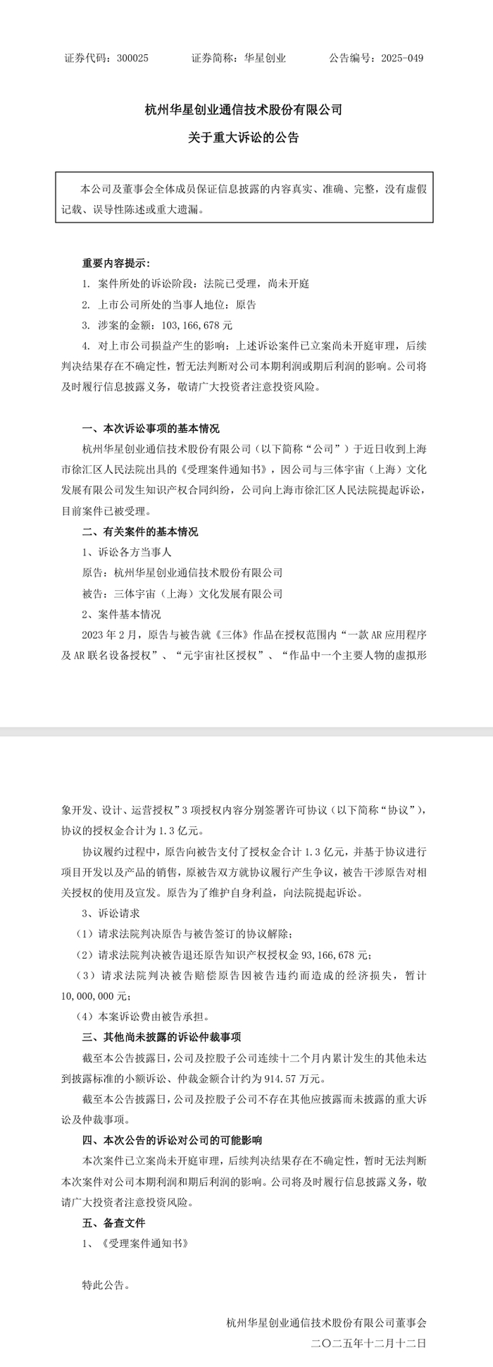 IT之家 12 月 11 日消息,上市公司杭州华星创业通信技术股份有限公司今日发布关于重大诉讼的公告,称近日收到上海市徐汇区人民法院出具的《受理案件通知书》,因公司与三体宇宙(上海)文化发展有限公司(被告)发生知识产权合同纠纷,公司向上海市徐汇区人民法院提起诉讼,目前案件已被受理,涉案金额 1.03 亿元(103,166,678 元)。