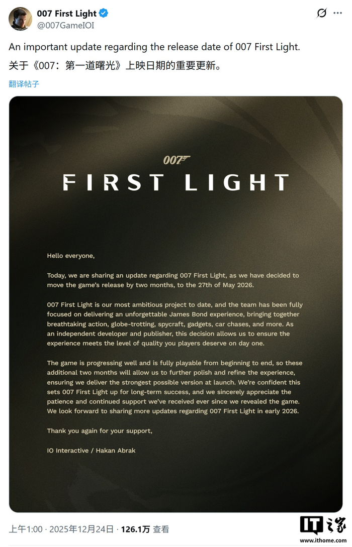 IT之家 12 月 24 日消息,《杀手》(Hitman)游戏开发商 IO Interactive 今天(12 月 24 日)宣布,将延期至 2026 年 5 月发行詹姆斯・邦德题材新作《007:初露锋芒》(007:First Light)。
