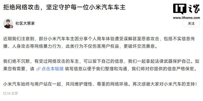 IT之家注意到,今年 9 月 26 日,小米官方在小米汽车社区发文 ——《拒绝网络攻击,坚定守护每一位小米汽车车主》,提到有受过网络攻击的车主,可以留下自己的信息,一起拿起法律武器保护自己。