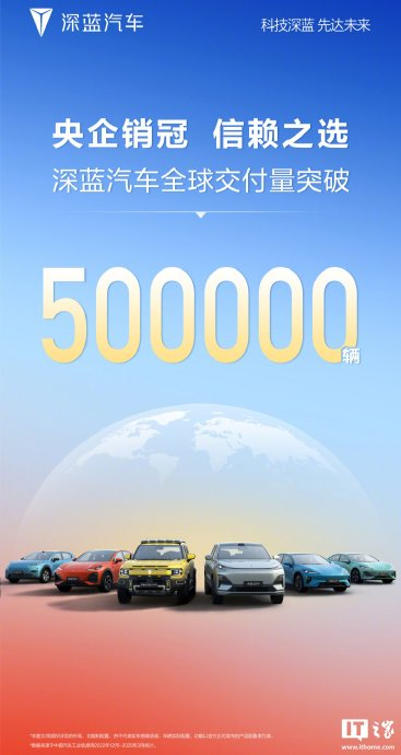 【长安#深蓝汽车全球交付量破50万辆#】6 月 10 日消息,长安深蓝汽车官方微博今日发文宣布:深蓝汽车全球交付量突破 50 万辆。官方海报小字显示,数据来源于中国汽车工业信息网 2022 年 12 月-2025 年 3 月统计。据IT之家此前报道,长安深蓝汽车 5 月全系交付 25521 辆,同比增长 78%、环比增长 27%。截至 5 月 22 日 24 时,深蓝 S09 大定订单累计突破 21168 台。