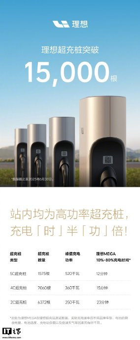 【理想超充桩突破 15000 根,目标年底达成 4000 座超充站布局】理想汽车宣布超充桩突破15000根,年底目标4000座超充站。其中5C超充桩峰值功率520千瓦,MEGA车型10%-80%充电仅需12分钟。#理想汽车# #新能源汽车#