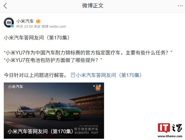 【小米汽车:SU7 / SU7 Ultra / YU7 电池坚持超高标准开发,均达成 2025 年新国标】小米汽车官方昨日晚继续更新答网友问(第 170 集),本次问答围绕小米 YU7 作为中国汽车耐力锦标赛的官方指定医疗车主要任务、YU7 在电池包防护方面做了哪些提升等问题进行了解答。