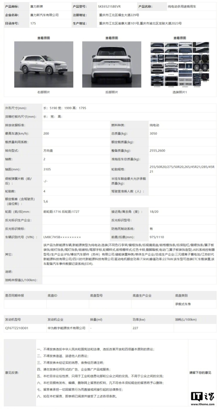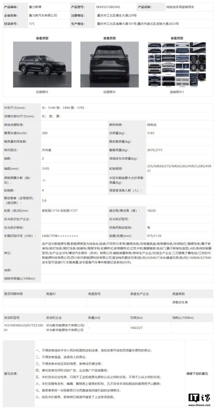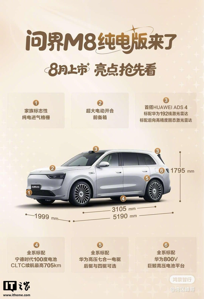 【鸿蒙智行问界 M8 纯电版汽车申报:三元锂离子蓄电池、华为数字能源发动机】在工信部最新公布的第 397 批《道路机动车辆生产企业及产品公告》新产品公示中,IT之家发现了鸿蒙智行家庭智慧旗舰 SUV 问界 M8 纯电版的身影。