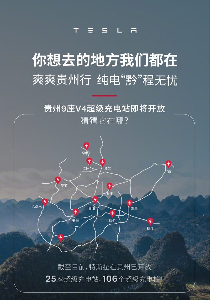 【特斯拉中国:贵州 9 座 V4 超级充电站即将开放】特斯拉中国今日宣布,贵州 9 座 V4 超级充电站即将开放。截至目前,特斯拉在贵州已开放 25 座超级充电站,106 个超级充电桩。
