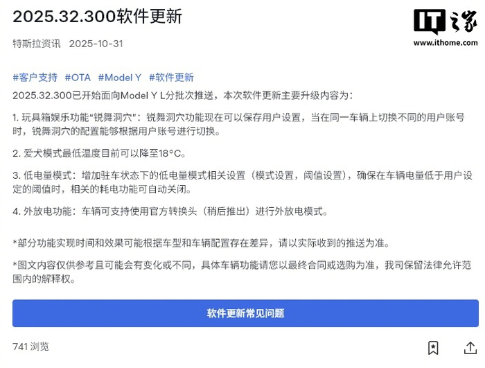 【#特斯拉正式支持外放电#:Model Y L 推送 2025.32.300 软件更新,新增低电量模式等功能】10 月 31 日消息,特斯拉今日宣布向 Model Y L 推送最新的 2025.32.300 软件更新,正式支持「外放电」功能。IT之家附原文如下:2025.32.300 已开始面向 Model Y L 分批次推送,本次软件更新主要升级内容为: