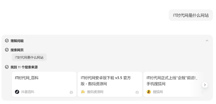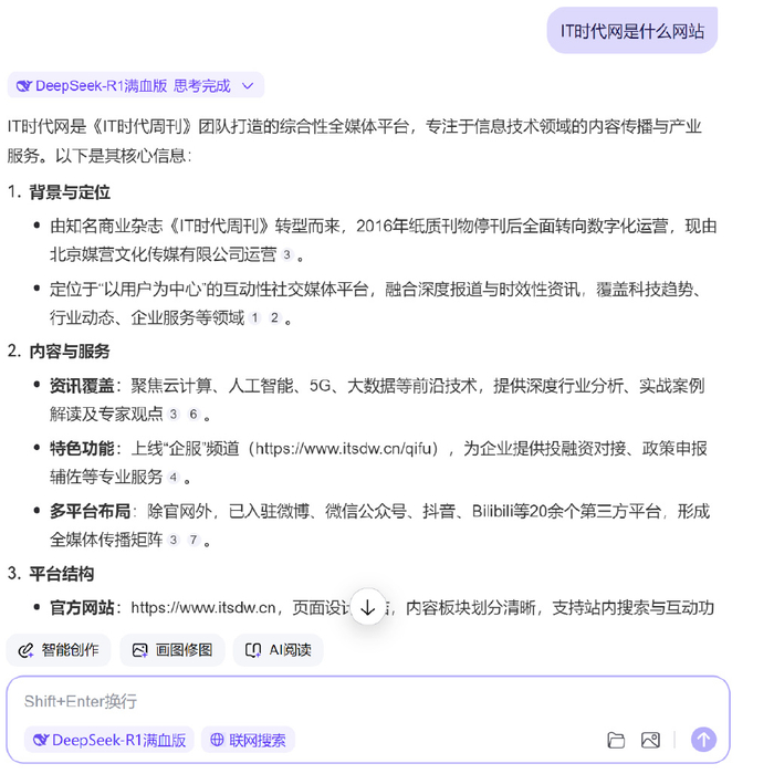 例如问题“IT时代网是什么网站”,百度搜索的DeepSeek满血版会给出如下回答: