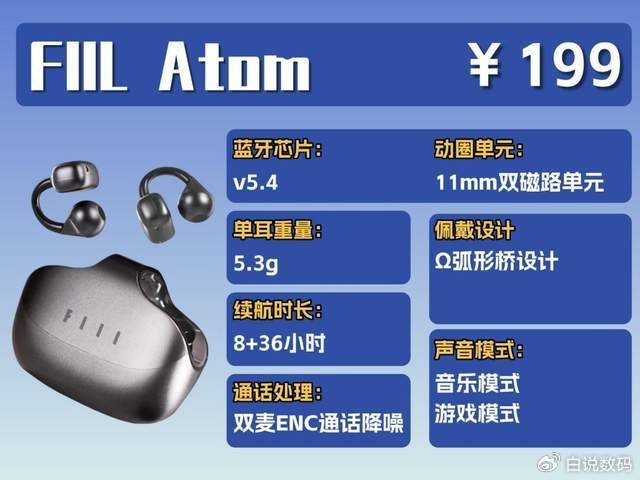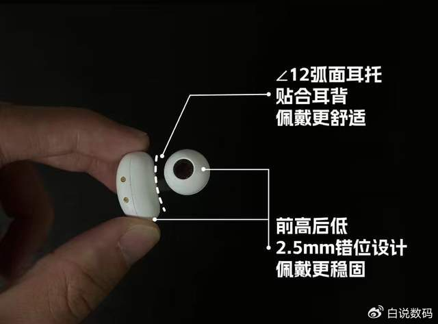 佩戴设计特别贴心,耳机用了2.5mm 的错位设计,戴在耳朵上是前高后低的样子,特别贴合耳朵形状,戴着特别稳;还有∠ 12° 的弧面耳托能给耳朵提供合理支撑,把耳机电池那块做成了弧形,能贴紧耳背,舒适度又上了一个台阶;单个耳机才4.5 克,就算戴好久,耳朵也没啥负担,完全不会有压迫感。